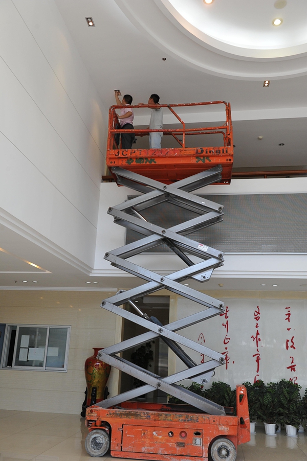 由于行政辦公樓和籃球場燈具均屬高空作業,中心組織照明物管室出于安全方面考慮,設施決定采取龍門架和液壓升降機相配合作業的施工方案。整個施工過程值班人員全程旁站,事無巨細監督施工單位做好各項安全防患措施,固定龍門架不偏移,檢查施工人員的安全繩。由于液壓升降機體型龐大,為了不影響員工的正常工作,確保施工質量和人員出入安全,行政辦公樓的燈具更換作業在提前做好施工公告的同時,避開上班高峰期,于5月28日圓滿地完成施工任務。