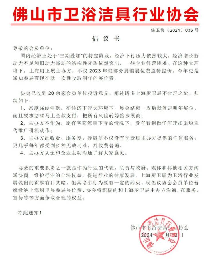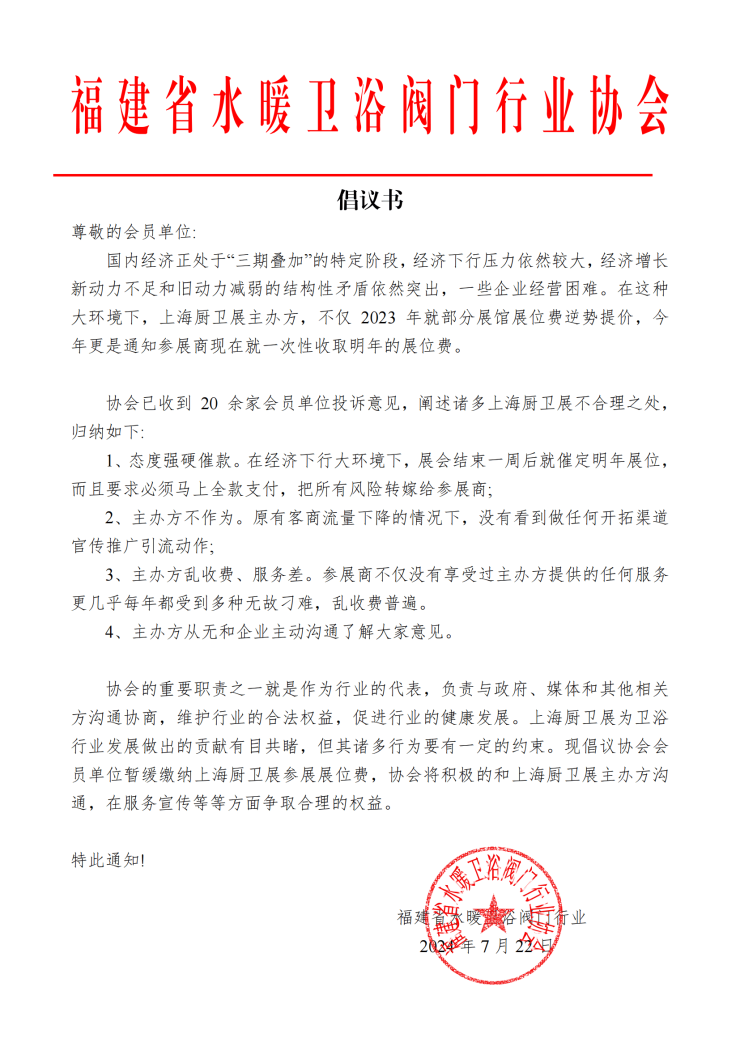繼佛山市衛(wèi)浴潔具行業(yè)協(xié)會7月12日發(fā)布《關(guān)于暫緩繳納2025年上海廚衛(wèi)展參展展位費倡議函》,因變浴行業(yè)協(xié)福建省水暖衛(wèi)浴閥門行業(yè)協(xié)會于7月22日發(fā)布《關(guān)于暫緩繳納2025年上海廚衛(wèi)展參展展位費倡議函》。更展