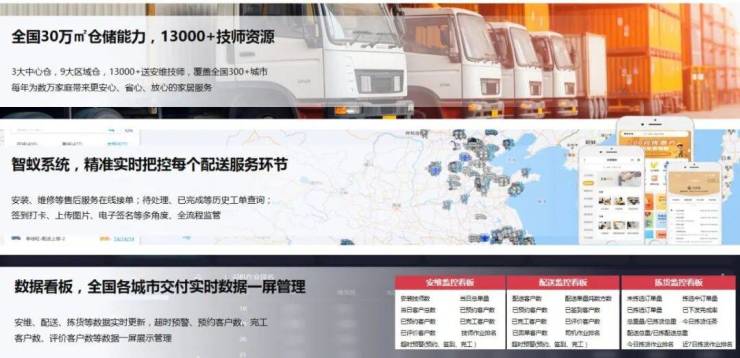 面對當前行業渠道碎片化、服務精細化的趨勢,華耐家居通過數字化系統升級,將銷售、運輸、交付、安維、技師、客服等進行全流程在線化覆蓋,實現服務的可視化管理。華耐家居自研的智蟻系統,能夠精準實時把控每個配送服務環節,通過數據看板,可以將全國各城市交付實時數據進行管理,提升整體的運營效率。